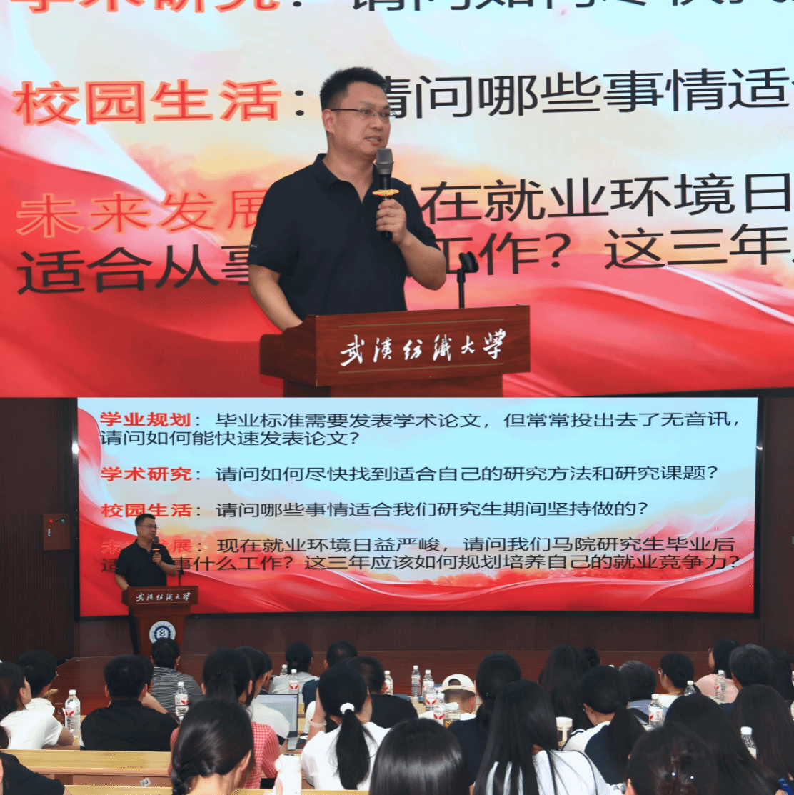 在院长答疑课环节,学院院长肖述剑教授针对新生关切的核心问题细致解答、精准指导。关于论文发表,他建议新生夯实写作基础,主动研究目标期刊风格、高效整合学术资源,同时强调研一阶段需重点参与读书分享,为学术研究积累素材;对于同学们选择研究方向的困惑,他鼓励新生以兴趣为导向,结合学术前沿与社会需求,依托导师指导明确研究路径;就业规划上,他指出同学们需主动适应经济、教育、技术领域发展变化,提升应变能力,同时坚守马克思主义理论学习初心。