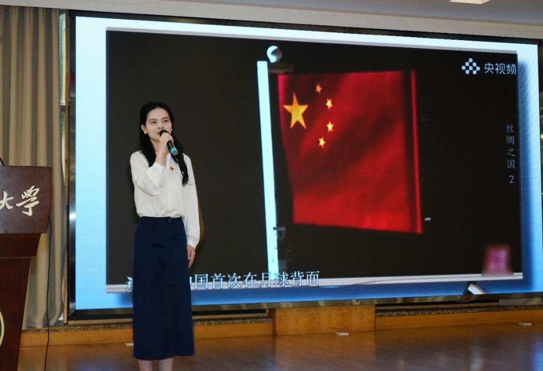 各支参赛队伍激烈角逐。其中,我校参赛作品《红旗映月背:科技创新中的材料"织"造》凭借鲜明的学科融合特色脱颖而出,生动演绎了新时代科技创新与思政教育相结合的创新范式。该作品聚焦2025年全国两会中“科技创新”的相关内容,以学校纺织特色文化、嫦娥六号月面国旗等为例,从研发玄武岩国旗的意义、选材、过程等出发,讲述了徐卫林院士团队研制玄武岩国旗所面临的困难与挑战,以及攻克这些挑战的艰辛历程。此外,该作品也号召广大学生要以青年科技工作者为榜样,将个人发展与科技创新、生态文明等中国式现代化建设相结合,为建设社会主义现代化强国奉献青春力量。