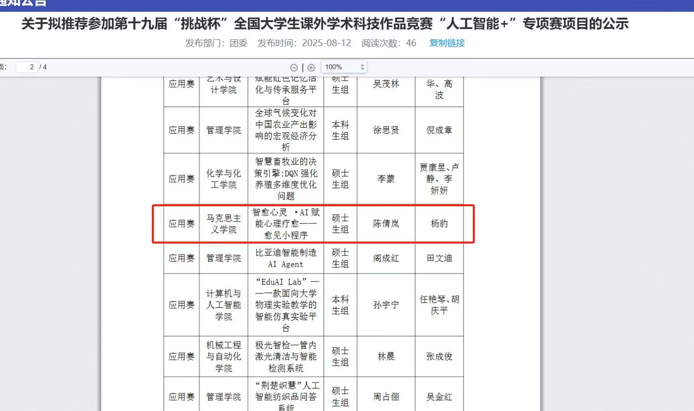 近日,从第十九届“挑战杯”全国大学生课外学术科技作品竞赛“人工智能+”专项赛道传来喜讯,williamhill英国陈倩岚同学的团队项目“智愈心灵。AI赋能心理疗愈—愈见小程序”在院赛中荣获一等奖,并成功通过校赛选拔,获得推优进入国赛资格。这一创新项目将人工智能技术与心理健康领域深度融合,展现了科技赋能社会福祉的无限可能。