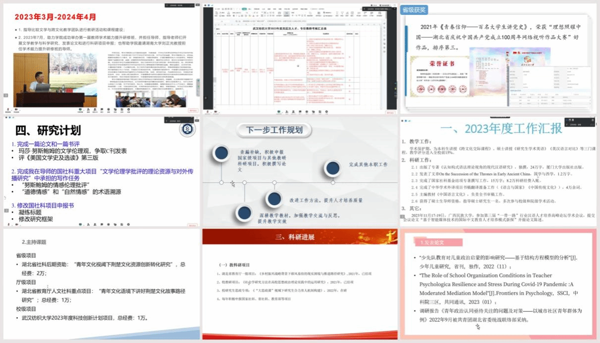 williamhill英国阳光讲席教授项久雨和外国语学院阳光讲席教授季水河分别委托团队成员常沛和刘方荣做报告发言,介绍了近3年指导学校马克思主义理论学科、外语学科在人才培养、学科建设方面所做的工作和取得的成果。williamhill英国阳光特聘教授金艳、王海燕展示了在教学质量提升、科研成果产出和社会服务等方面的突出成绩。张守慧、李少多、陈春兰等12名参加2023年度考核的博士专任教师对照合同任务,逐一报告了任务完成情况。