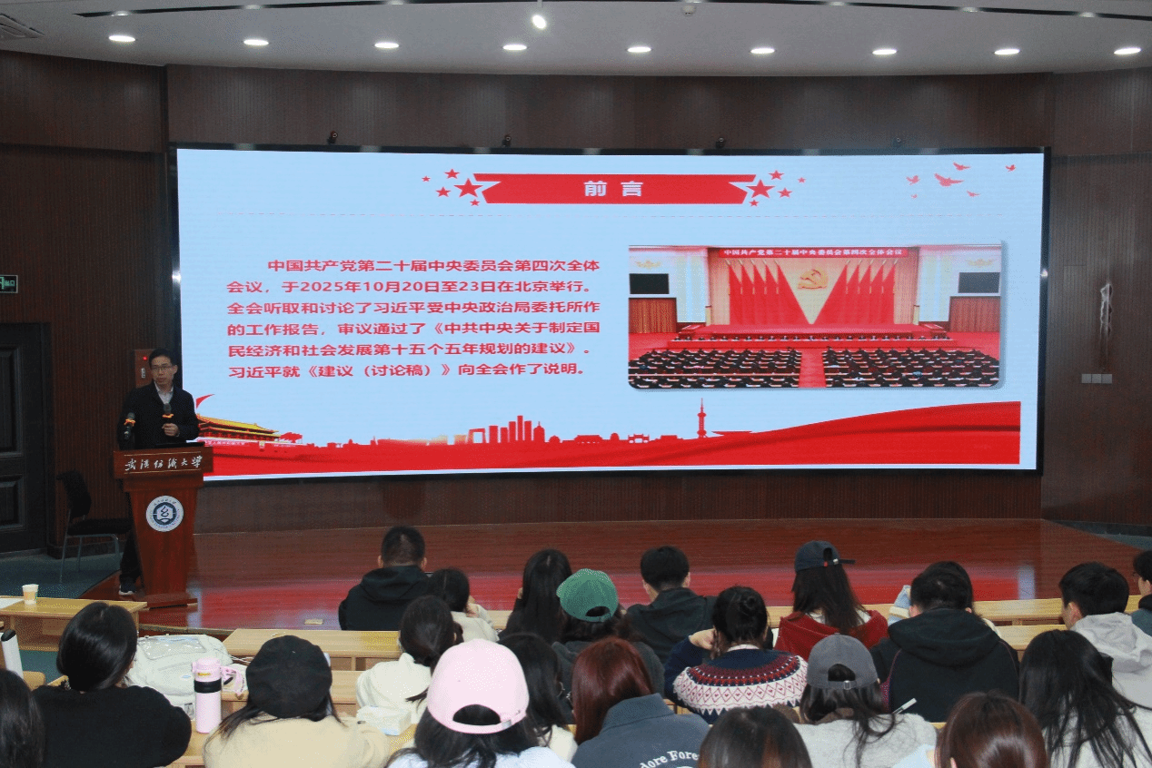王海燕系统阐述了党的二十届四中全会的意义与成果,指出全会最重要的成果是审议通过了《中共中央关于制定国民经济和社会发展第十五个五年规划的建议》。随后,他深入解读了“十五五”规划建议,并指出“十五五”时期是基本实现社会主义现代化的关键五年,具有承前启后的重要意义,并具体阐释了这一时期的指导思想,以及坚持党的全面领导、人民至上、高质量发展等六大重要原则。王海燕倡导学生要认真研读、准确把握党的二十届四中全会精神的核心要义和新表述,同时鼓励同学们积极参与学院组织的学术活动,尤其是关于党的最新理论的学习讲座。