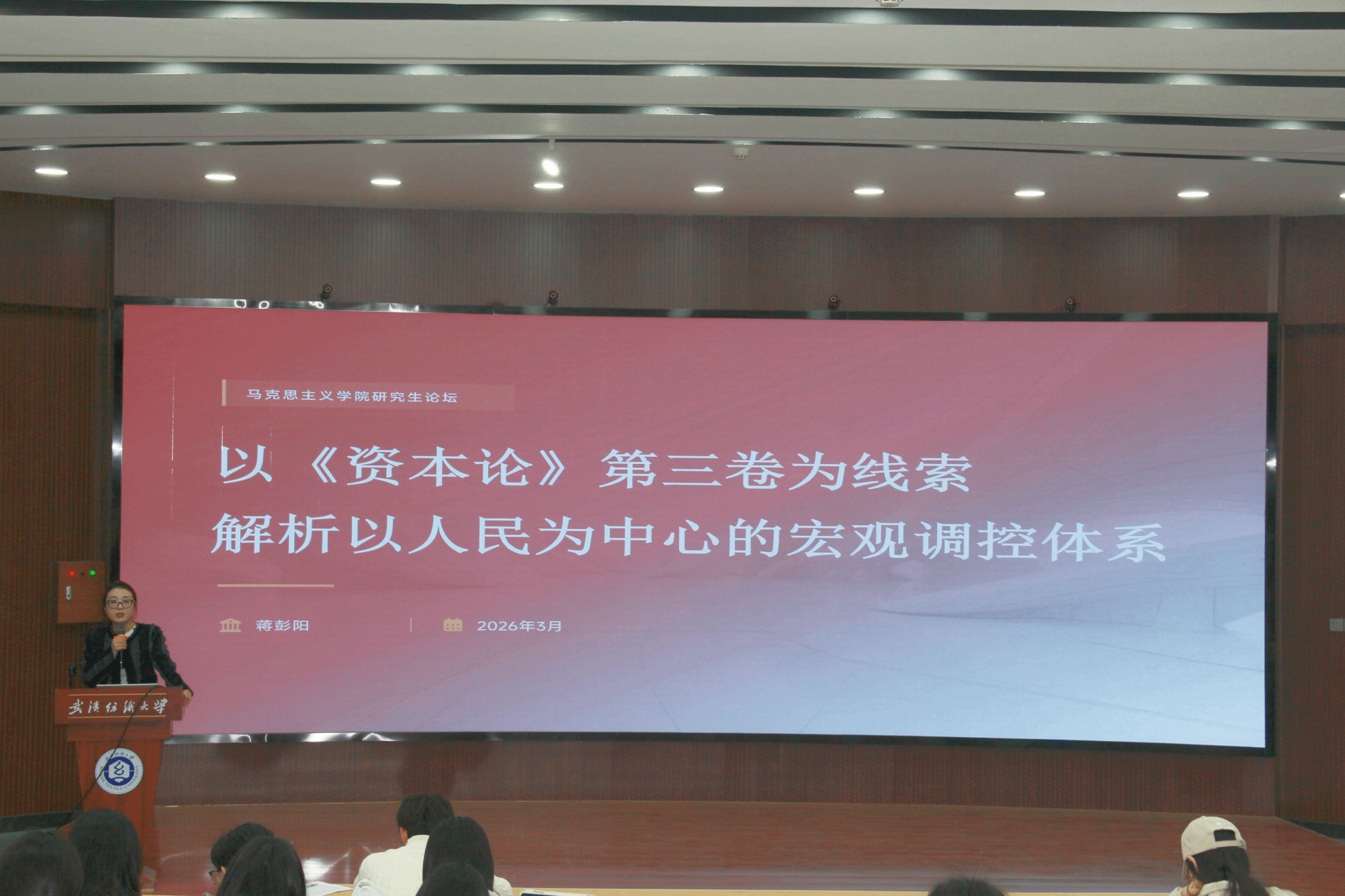 蒋彭阳从《资本论》第一卷开始引入,以第三卷为线索,围绕 “以人民为中心的宏观调控体系”,系统解读社会主义宏观调控的理论内核、深层逻辑与实践路径。她首先指出,资本主义与社会主义宏观调控本质差异在于:资本主义调控服务于资本增值,而中国特色宏观调控以人民需要为根本导向。随后,她结合社会总资本再生产理论、两种社会必要劳动时间、生产价格与平均利润率等核心观点,阐释社会主义宏观调控的总依据、总目标,强调宏观调控的目标不仅是保障“有钱花”,更要保障“有好东西花”。最后,她阐述了我国宏观调控的实施主体与政策手段,强调我国坚持党中央集中统一领导,实现全国一盘棋、各部门协同发力;同时构建起七大政策协同体系,形成以人民为中心的宏观调控体系。