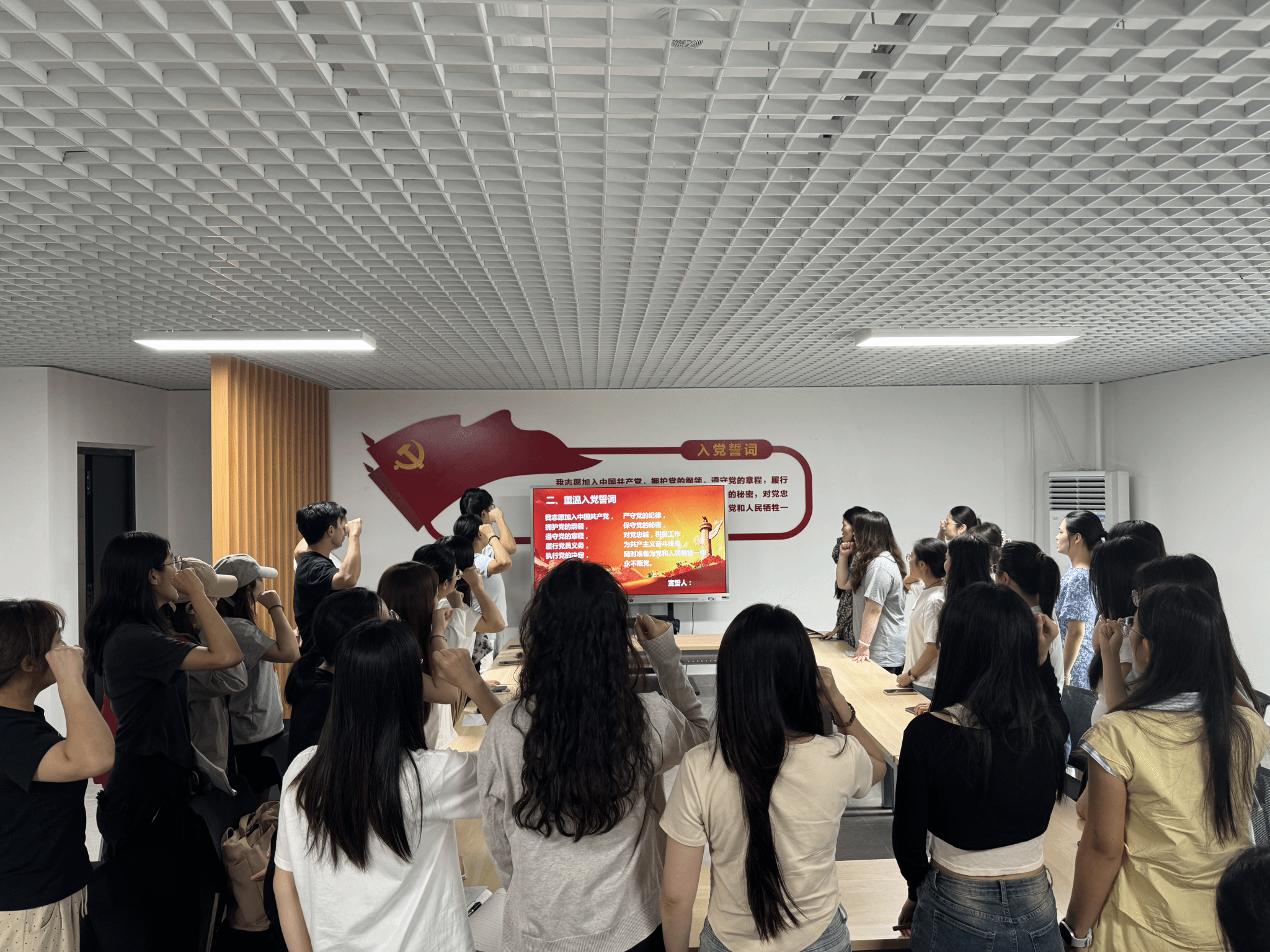 会议伊始,全体党员唱国歌,重温入党誓词。