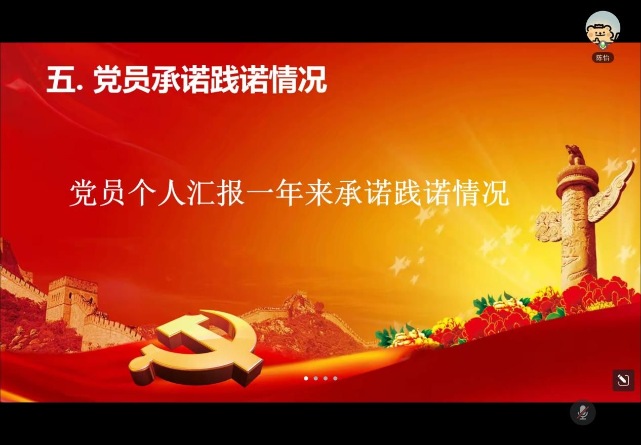 最后,每位党员汇报一年来的承诺践诺情况。在思想政治方面,党员们通过持续深入学习党的理论知识,积极参加各类党性教育活动,进一步坚定理想信念,始终在思想上、政治上、行动上同党中央保持高度一致。在作风纪律方面,党员们认为自身能够严格遵守党的纪律和规矩,做到廉洁自律。在工作学习领域,党员们分享了自己在专业学习、科研项目、社会实践等方面取得的成绩和进步。在下沉服务办实事方面,党员们一一讲述了参与社区志愿服务、帮扶困难群众等实践活动的经历和感悟。