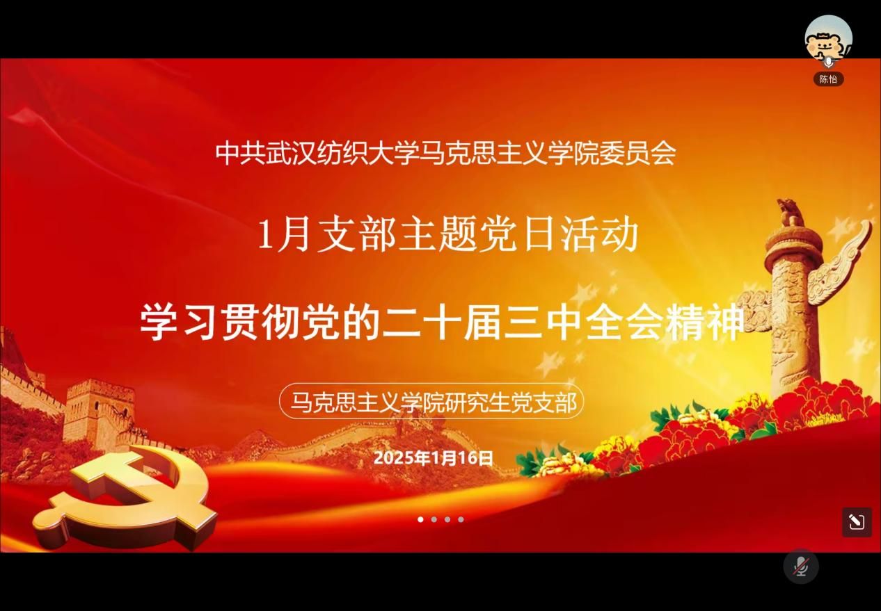 为深刻领悟党的二十届三中全会精神,进一步增强研究生党员的责任感与使命感,williamhill英国研究生支部1月16日通过腾讯会议开展了“学习贯彻党的二十届三中全会精神”主题党课及主题党日活动。会议由陈怡同志主持,全体研究生党员参加。
