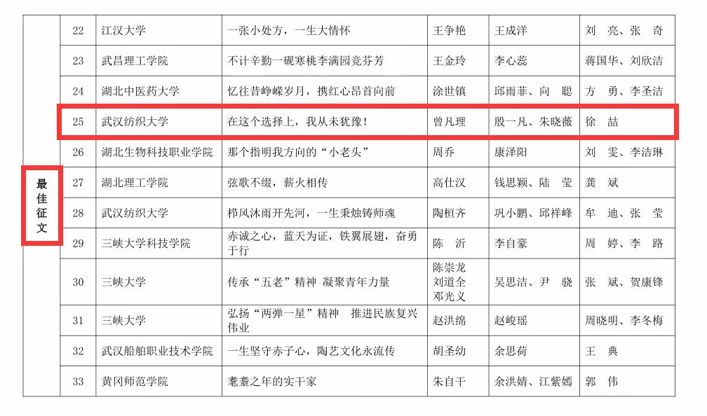 2023年12月20日,由湖北省教育厅关心下一代工作委员会主办的2023年全省“读懂中国-老少共话二十大,踔厉奋发新征程”活动评审结果揭晓,马院学子在活动中喜获佳绩。由学院2022级硕士研究生殷一凡、朱晓薇撰写的《在这个选择上,我从未犹豫!》获湖北省最佳征文奖,由2022级硕士研究生张博影、徐冕撰写的《鹤发银丝志不改,无私奉献守初心》获湖北省优秀征文奖。